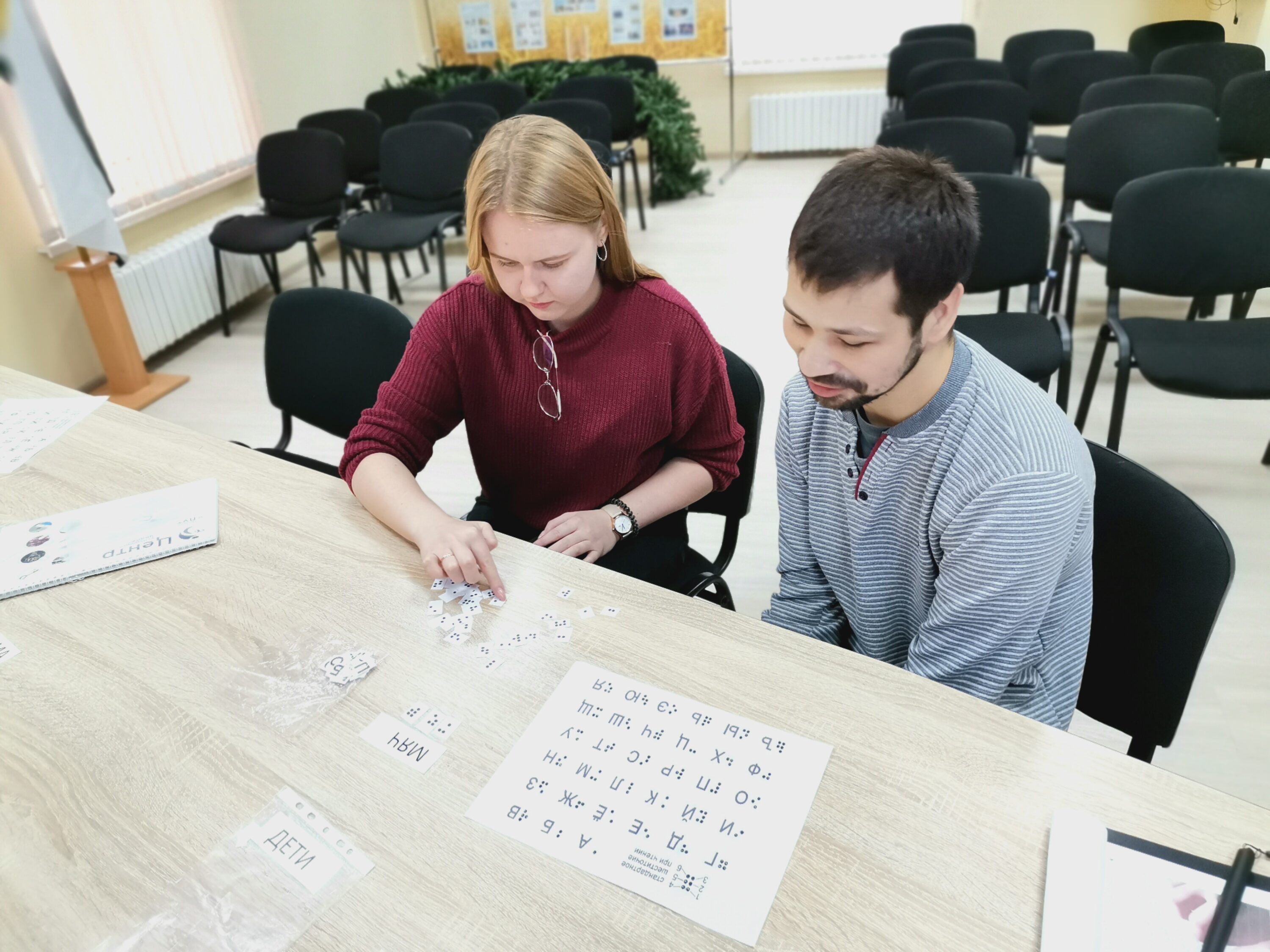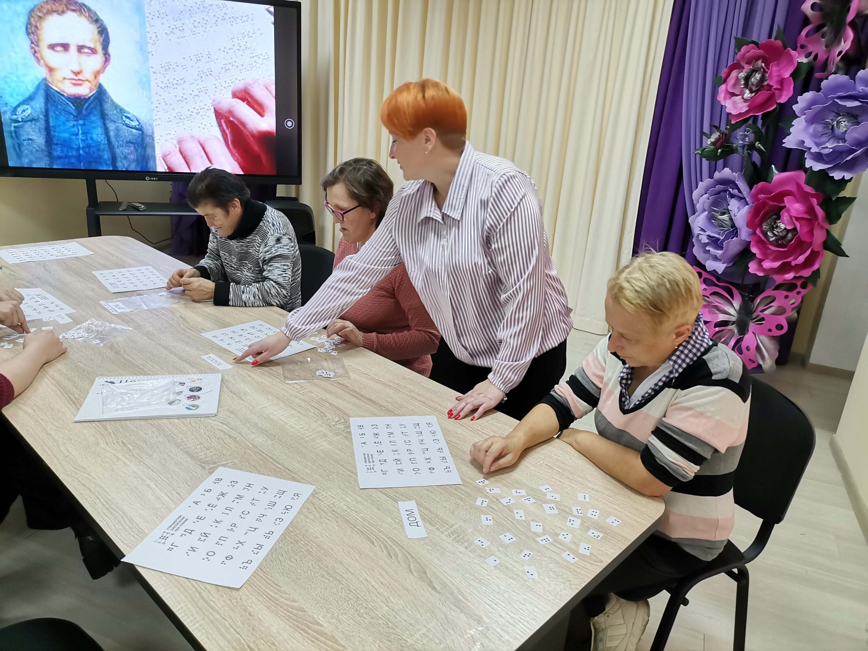 13 ноября 2025 г. в отделении социальной реабилитации, абилитации инвалидов ЦСОН Кореличского районапрошёл тематический час «Они видят мир сердцем» для посетителей отделения. В ходе мероприятия ребята познакомились с датами всемирного календаря: Международный день слепых и Международный день Белой трости – символ незрячего человека. Особое внимание было уделено выдающимся людям с ограниченными возможностями: Эдуард Асадов, Гомер, Галилео Галилей и Ванга, Диана Гурская, которые, несмотря ни на что, добились невероятных успехов. Поговорили о помощниках слепых людей собаках-поводырях. Их главная цель – помогать слепым и слабовидящим людям перемещаться вне помещений и избегать столкновений с предметами. Должное внимание уделили шрифту Брайля: изучили тактильно, попробовали самостоятельно прочитать слова.