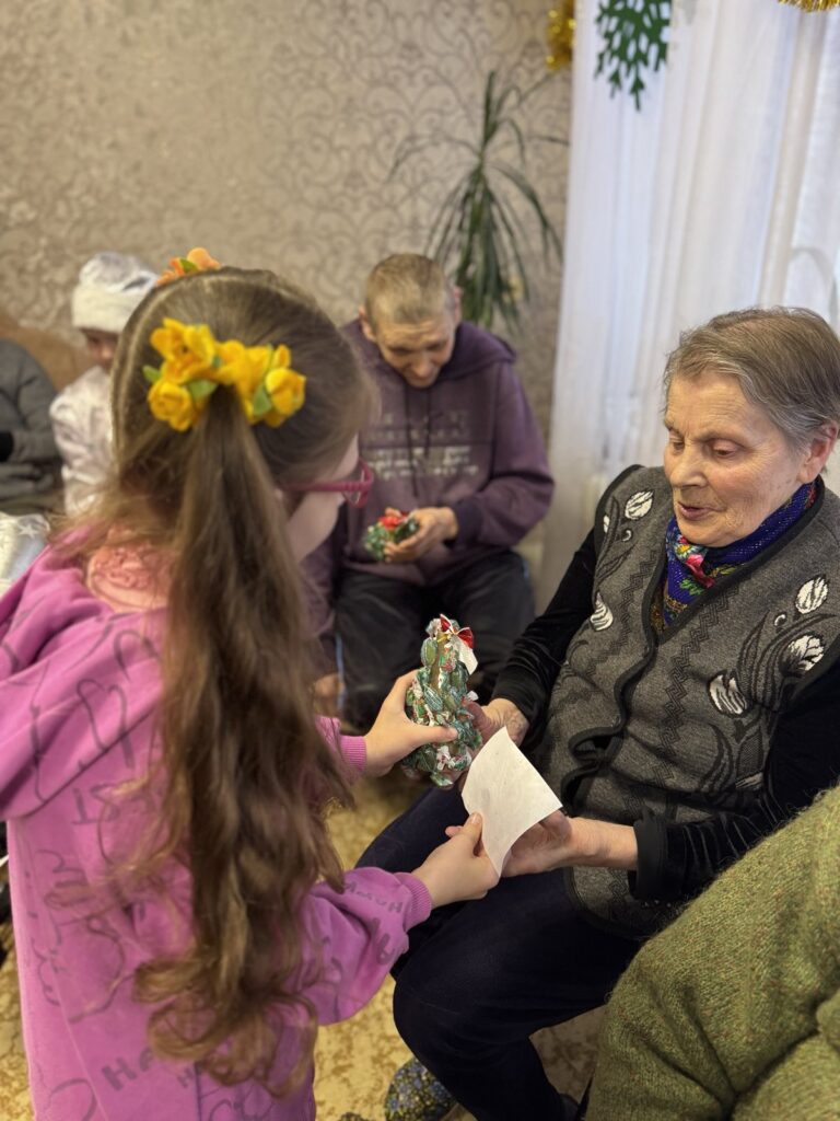 В уютном зале отделения собрались проживающие и сотрудники отделения. Ребята пришли под руководством педагогов и подготовили короткую программу: небольшую театральную сценку про мастерскую добра, несколько стихотворных номеров, знакомые песни и персональные открытки‑поделки, сделанные руками школьников.