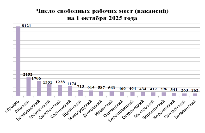 Нанимателями на 1 октября 2025 года заявлены сведения о наличии 21257 свободных рабочих мест, что на 7,0 процента больше, чем на 1 октября 2024 года (19865). Спрос на работников по рабочим профессиям составил 69,6 процента от общего числа вакансий (на 1 октября 2024 г. – 65,8 процента).