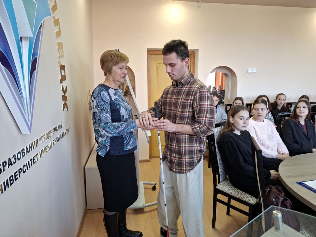 21 октября 2025 года прошла встреча «В центре внимания – человек с белой тростью» в рамках Республиканской акции «Человек с белой тростью» для учащихся 2 и 3 курсов по специальности педагогическое сопровождение Волковысского колледжа УО «Гродненский государственный университет имени Янки Купалы».