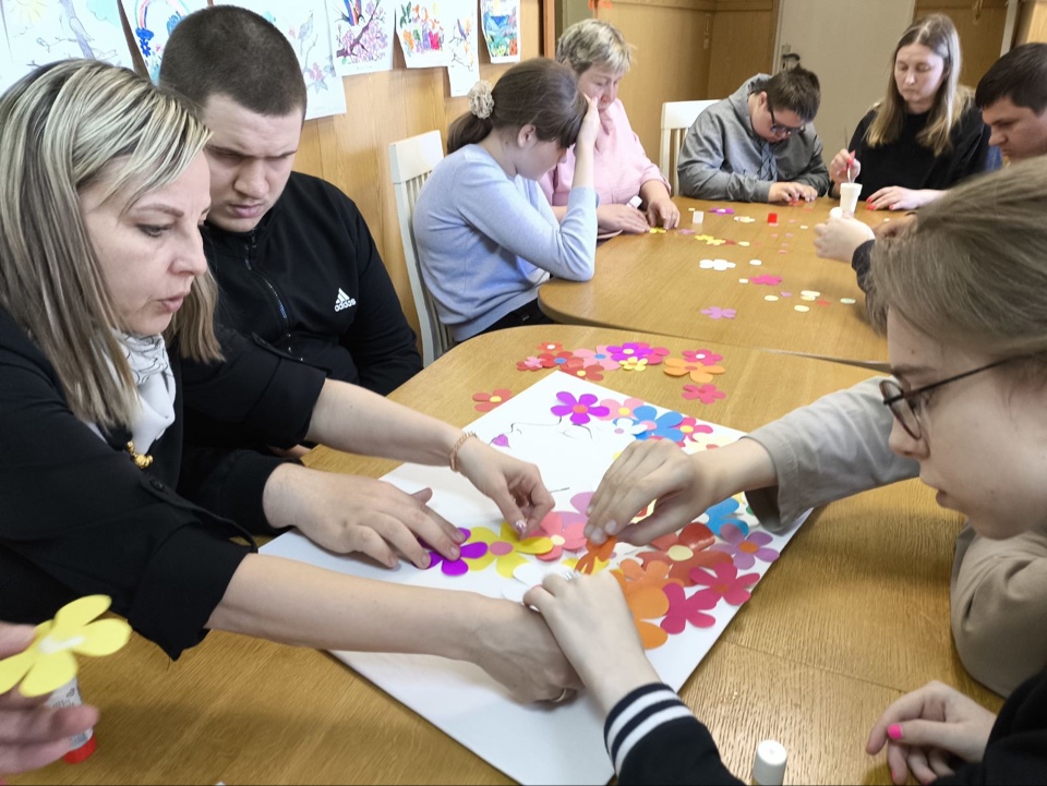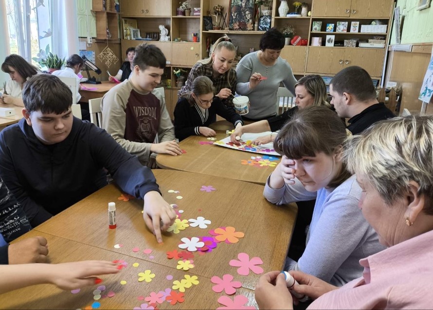 Вторым этапом встречи стала коллективная работа над панно. Ребята работали в группах, вырезали, собирали и наклеивали цветы. Панно посвящено Году белорусской женщины.